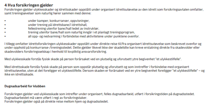 Komplette vilkår finner du her. Merk at det er den organiserte delen av klubbaktiviteten som dekkes. Egentrening er i utgangspunktet den enkelte utøvers ansvar. Organisert aktivitet inkluderer også dugnad.