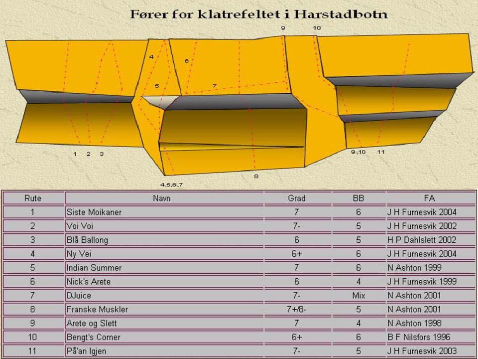 Klatrefeltet i Harstadbotn har en rekke ruter, men vanskelighetsgraden på disse starter relativt høyt, så vi anbefaler ikke nybegynner å prøve seg her med det første. Steintypen i Harstadområdet er oftest skarp og flak kan være løse. Bruk hjelm og vær forsiktig.