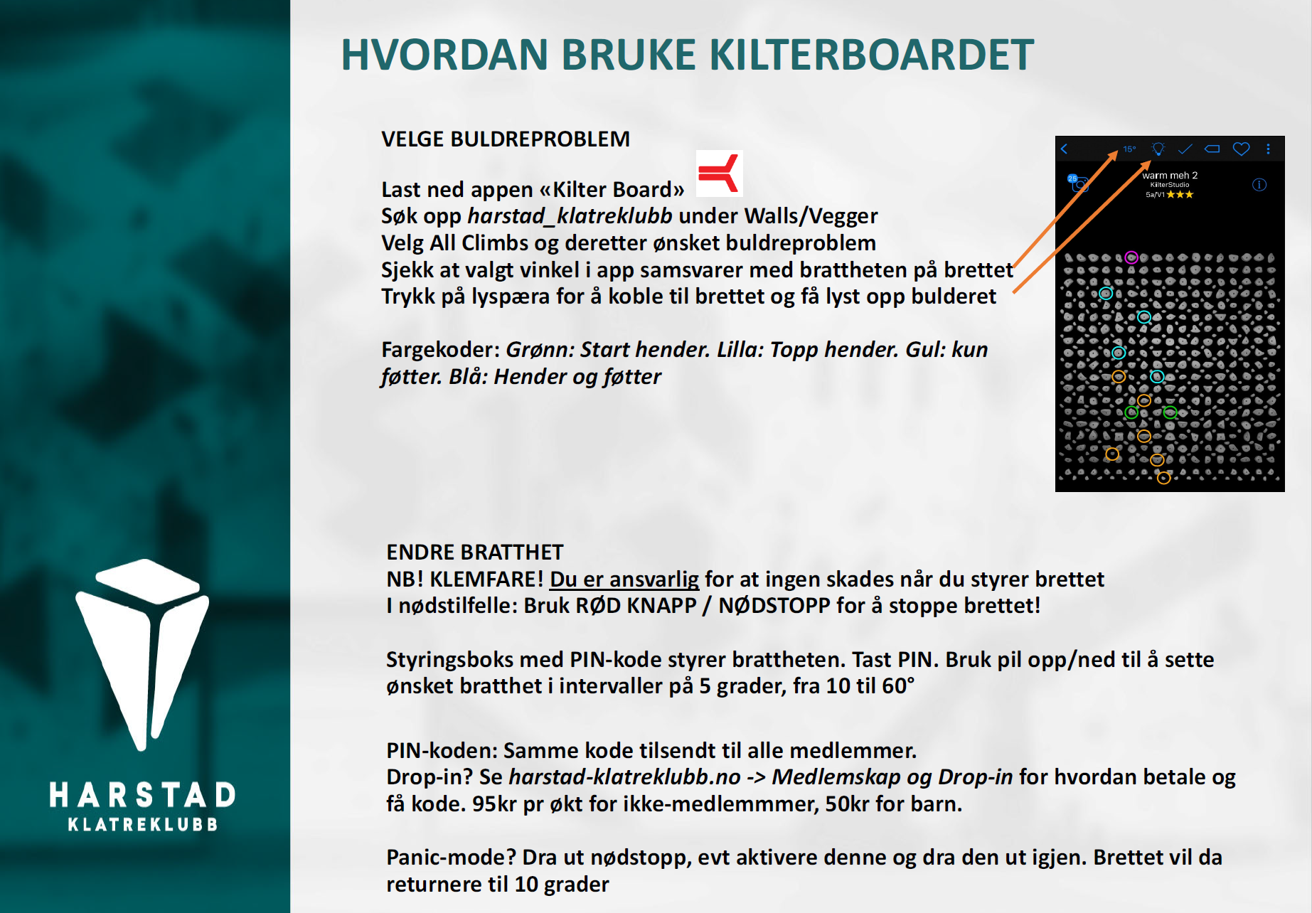 Harstad Klatreklubb anskaffet i 2025 systemveggen Kilterboard. Du finner det i Hålogalandshallen på venstre side av Klatreveggen.